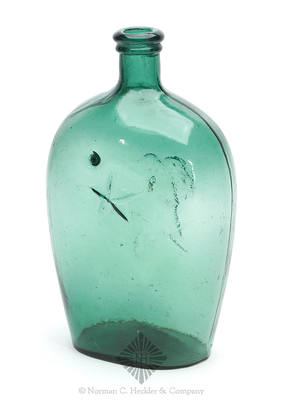 Lot: 121 Sheaf Of Wheat - Five Pointed Star Pictorial Flask, possibly Bulltown Glass Works, Bulltown, New Jersey, 1845-1860. Medium teal green, applied double collared mouth - iron pontil mark, quart. GXIII-38 A big, bold flask with a crisp mold impression and beautiful color. Fine condition.