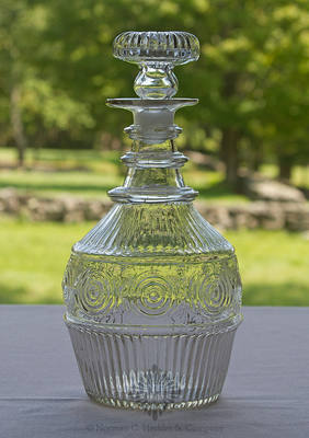 Lot: 36 Blown Three Mold Decanter, possibly Boston and Sandwich Glass Works, Sandwich, Massachusetts, 1820-1840. Bulbous form with type 18 stopper and three applied neck rings, colorless, tooled flared mouth with period stopper - pontil scar, quart. Unlisted in McKearin's text, Type 18 stopper A simple and attractive mold design. Fine condition. Estimate: $150 - $300 Minimum bid: $70 Price Realized: $211 |