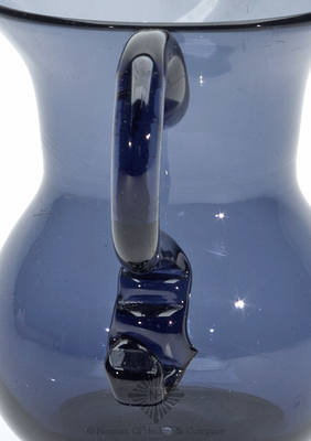 Lot: 123 Freeblown Creamer, America, 1820-1850. Bulbous form flaring to rim with applied circular foot and solid handle, medium indigo violet, tooled flared rim with pour spout - pontil scar, ht. 3 7/8 inches, greatest dia. 2 11/16 inches. Similar in form and construction to PG plate 38, right Attractive lighter color and appealing size. Fine condition. Dr. Charles and Jane Aprill collection.