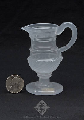 Lot: 156 Pattern Molded Creamer, America, 1820-1840. Bulbous form flaring to rim with circular foot on stem with two button knopf, solid handle and threads around rim and mid body with twenty two rib gadroon pattern on lower body, moonstone, tooled flared rim with pour spout - pontil scar, ht. 3 5/8 inches, base dia. 1 15/16 inches; (loss of rigaree at end of handle). Similar in form and construction to McK plate 55, #4 A piece which exhibits the skills of a master gaffer. Attractive color, form and size. Dr. Charles and Jane Aprill collection. Estimate: $1,000 - $2,000 Minimum bid: $500 Price Realized: $1,170 |