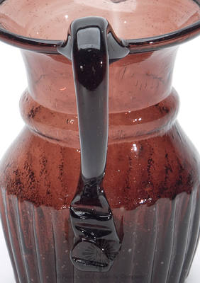 Lot: 165 Mold Blown Creamer, two piece mold construction, probably America, 1840-1860. Cylindrical flaring to rim with applied solid handle, vertically ribbed body, medium raspberry puce, tooled inward folded rim with pour spout - tubular pontil scar, ht. 3 3/4 inches, greatest dia. 2 1/2 inches; (2 inch fissure at lower handle attachment). Unusual form and beautiful color. Dr. Charles and Jane Aprill collection.