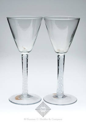 Lot: 212 Pair Of Freeblown Wine Glasses, England, 1740-1760. Conical bowls with cotton twist stems on applied circular feet, colorless with opaque white twist in stem, tooled rims - pontil scars, ht. 7 inches. Similar in form and construction to KW fig. 26, #2 Simple and elegant. Fine condition. Dr. Charles and Jane Aprill collection.